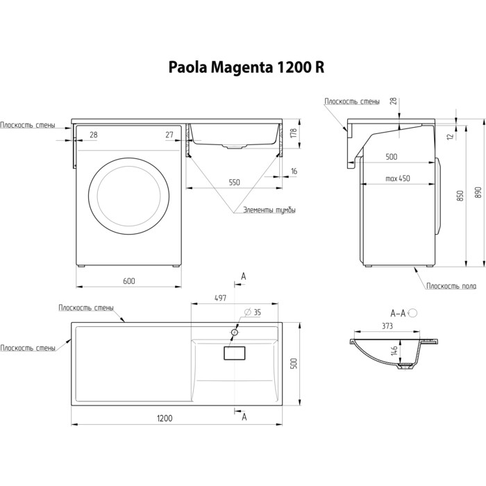 ПАОЛА  Маджента 120х50 P/L Раковина на стиральную машину белая  PAOLA (Россия)